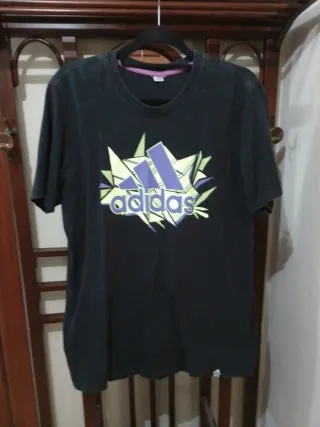 Camiseta de manga corta con un diseño gráfico llamativo en la parte delantera. - Estampado con el logo de Adidas. - Detalles en morado y verde lima.