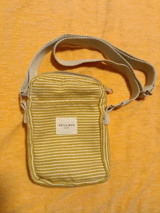Bolso bandolera con un diseño de rayas. - Rayas horizontales en amarillo y blanco. - Etiqueta de la marca DELAMUR en la parte frontal.