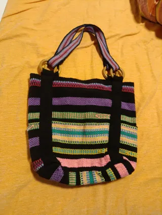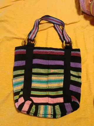Bolso tejido a mano, con un diseño único. - Estilo artesanal de Costa Rica. - Asas con detalles de madera. - Tejido con franjas de colores.