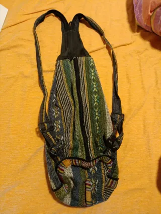 Mochila de estilo hippie, versátil y con un diseño transformable en riñonera. - Tejido con rayas multicolores. - Bolsillo frontal con cierre de botón de madera. - Compartimento principal con cremallera. - Correa ajustable para llevar como mochila.