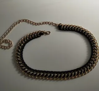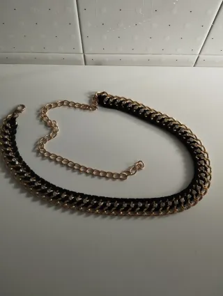 Elegante y precioso cinturón de fiesta con un diseño de cadena. - Adornado con piedras de strass. - Combina detalles en dorado y negro. - La cinta negra que lo adorna es de terciopelo. - Aporta un toque de brillo a tu atuendo. - Cadenita dorada para hacerlo extensible. - Cierre de mosquetón. - Largo 67cm + 40 cm de cadenita. - No se enegrece, el dorado está como el primer día. - No se ha usado nunca.