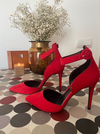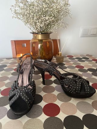 Sandalias de tacón con plataforma de madera. - Diseño de tiras cruzadas. - Hebilla ajustable en el tobillo. - Tacón grueso y robusto.
