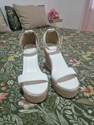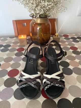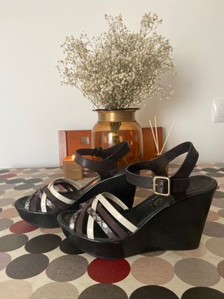 Elegantes cuñas de piel con un diseño cruzado. - Tiras en color negro, blanco y estampado. - Cierre de hebilla. - Detalle de piel en la plantilla.