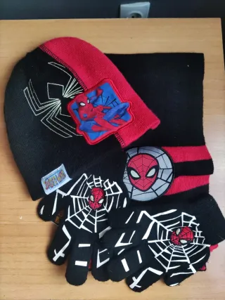 Conjunto infantil de invierno con temática de Spiderman. Incluye gorro, bufanda y guantes. Talla única - Gorro con diseño de Spiderman y araña. - Bufanda a juego con detalles. - Guantes con estampado de telaraña y Spiderman.