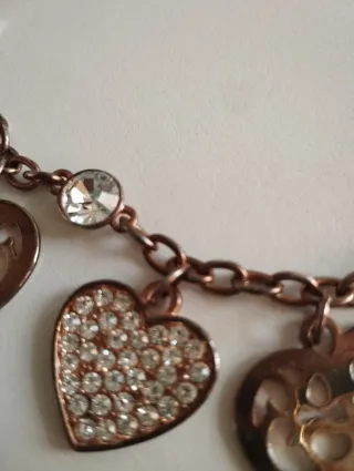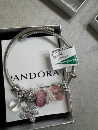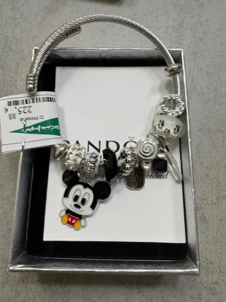 Pulsera de la marca Pandora con varios charms. - Charm de Mickey Mouse. - Charm con huellas de perro. - Charm con forma de espiral. - Charm con piedras brillantes.