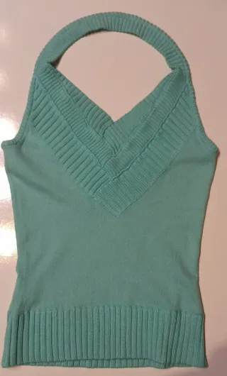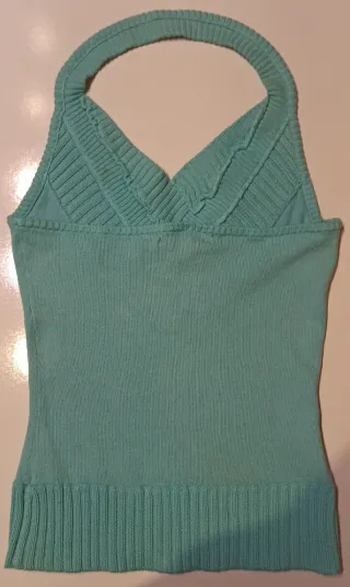 Top de tejido estilo halter. - Diseño de cuello halter. - Acabado de canalé en el bajo y el escote. - Tejido suave y cómodo. Top halter tejido en color turquesa– estilo único y favorecedor Precioso top sin mangas con escote halter en V, tejido en punto suave y elástico. Color turquesa vibrante que resalta cualquier tono de piel. Diseño con textura acanalada en el cuello y el bajo, que aporta ajuste y estilo. Ideal para verano o para combinar con chaquetas en entretiempo. Talla S, en perfecto estado, sin signos de uso. ¡Perfecto para darle un toque original a tu armario!