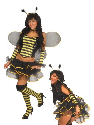 Disfraz de abeja con detalles llamativos. - Diseño de rayas amarillas y negras. - Incluye alas y antenas. - Falda con volantes. - Calcetines a juego.