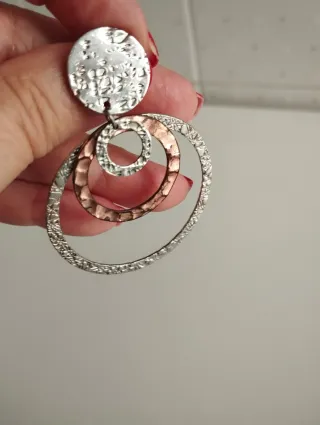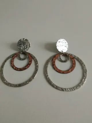 Pendientes largos con diseño de círculos entrelazados. - Acabado martillado en los aros exteriores. - Aros interiores en tono dorado y plateado. - Cierre de presión.