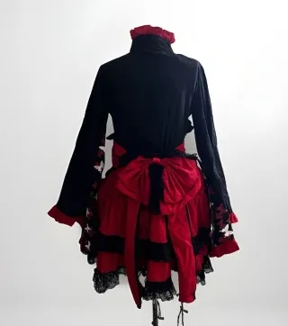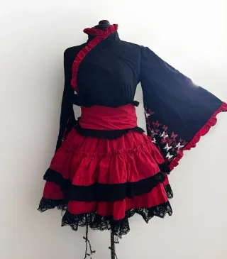 Conjunto de disfraz inspirado en estilos gótico, lolita, yukata, geisha y kimono. Presenta un diseño de cuatro piezas con detalles llamativos. Carnaval - Mangas amplias con volantes. - Adorno de mariposas en las mangas. - Falda voluminosa con varias capas y encaje negro. - Falda bajera para dar más volumen - Cinturón ancho rojo. Calcetines o zapatos de la 3era foto no incluidos