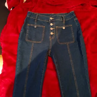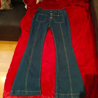 Pantalón vaquero de corte campana con un diseño muy original. Elástico - Costuras decorativas en contraste. - Cierre de botones. - Bolsillos frontales. - Estilo acampanado.