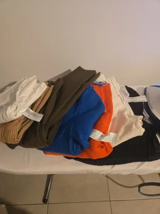 Conjunto de varias prendas de ropa en talla M. - Variedad de colores: blanco, marrón, verde oliva, azul, naranja y negro. - Tejidos cómodos y versátiles.