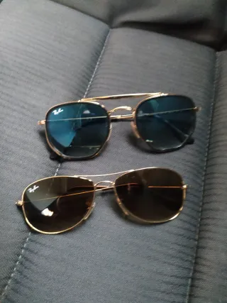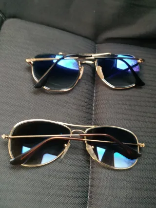 Elegantes gafas de sol con doble puente y montura dorada. A los dos 100€ - Lentes de color azul. - Lentes de color marrón.