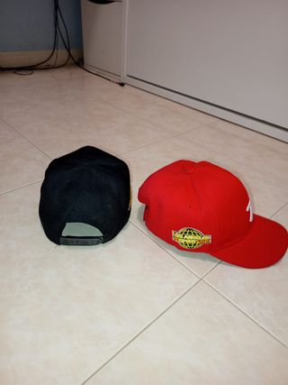 Pack de dos gorras de talla única. - Gorra negra con letra A blanca. - Gorra roja con letra A blanca.