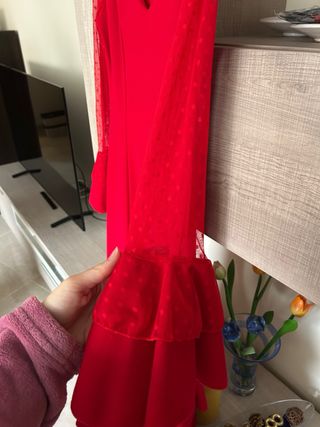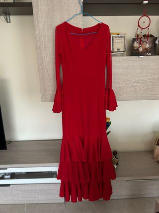 Elegante vestido de flamenco con un diseño vibrante. - Mangas largas con detalles de lunares. - Falda con volantes escalonados. - Escote en V.