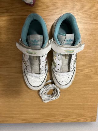 Zapatillas Adidas Forum Mid en tonos grises y blancos. Un diseño clásico y versátil. - Detalle de las tres rayas icónicas de Adidas. - Logo de Adidas en el lateral. - Perforaciones en la puntera para ventilación.