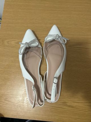Elegantes bailarinas blancas con un detalle de lazo adornado con pedrería. un solo uso - Diseño de punta afilada. - Tira trasera ajustable con hebilla. - Panel lateral transparente.