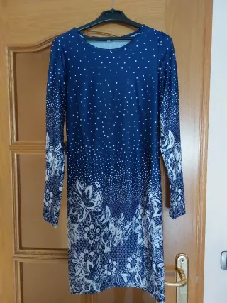 Vestido de manga larga con un diseño original. - Estampado de lunares blancos sobre fondo azul. - Parte inferior con diseño floral blanco. - Mangas con detalle de lunares y flores.