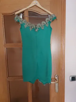 Elegante vestido de fiesta en color verde con un diseño único. - Escote con apliques de encaje dorado. - Adorno de encaje dorado en el lateral. - Corte asimétrico. Talla S-M