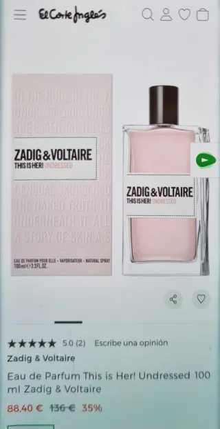 Eau de Parfum Zadig & Voltaire This is her! Undressed de 100ml nuevo precintado y original 100%. - Formato vaporizador. - Contenido: 100 ml / 3.3 fl.oz.