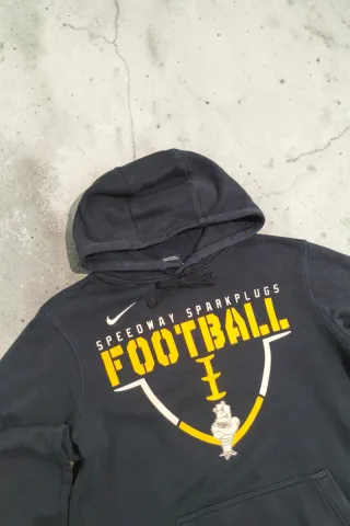 ⚡ Sudadera negra con capucha Nike con diseño gráfico de "Speedway Sparkplugs Football". 🏷️ Talla: S (Talla estimada por medidas que coincide perfectamente con la etiqueta). 📏 Medidas: 61 cm de largo x 46 cm de hombro a hombro. 🎨 Color: Negro con estampado central en amarillo y blanco. ✅ Estado: Buen estado general. Presenta un ligero desgaste natural del color típico de los lavados, pero sin roturas ni manchas. 🔎 Detalles: Capucha con cordones, bolsillo canguro frontal, logo Swoosh de Nike bordado y gran estampado deportivo en el pecho. #nike #nikehoodie #nikesweatshirt #sudadera #sudaderanike #hoodie #blackhoodie #speedw