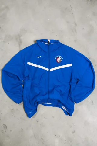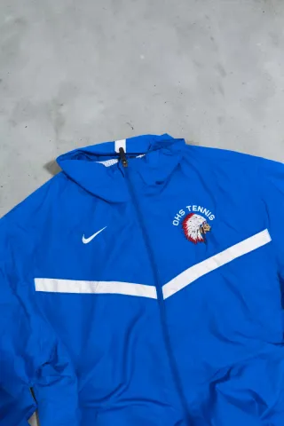 ⚡ Cortavientos ligero deportivo Nike Dri-Fit del equipo de tenis "OHS". 🏷️ Talla: L (La talla estimada por las medidas no coincide con lo que indica la etiqueta). 📏 Medidas: 70 cm de largo x 52 cm de hombro a hombro. 🎨 Color: Azul vibrante con detalles en blanco y parche multicolor. ✅ Estado: Muy bueno. No se aprecian desgastes, manchas ni roturas. 🔎 Detalles: Cierre frontal de cremallera completa, tejido transpirable Dri-Fit, logo Swoosh característico bordado, parche bordado de "OHS TENNIS" con mascota clásica y franja blanca en el pecho estilo chevron. #nike #nikewindbreaker #cortavientosnike #chaquetanike #drifit #ohs