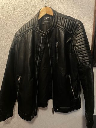 Cazadora de polipiel negra de la marca Zara, sin estrenar. - Diseño moderno con cuello mao y detalles acolchados en hombros y mangas. - Cierre frontal con cremallera. - Dos bolsillos laterales con cremallera. - Un bolsillo en el pecho con cremallera. - Puños ajustables con botón a presión.