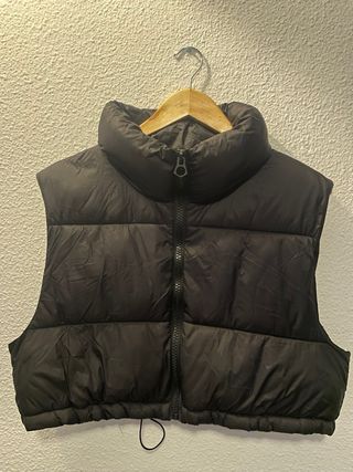 Chaleco acolchado negro con cuello alto y cierre de cremallera. - Diseño cropped. - Bajo ajustable con cordón. - Sin mangas.