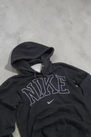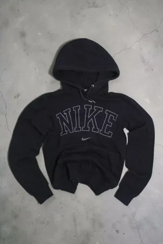 ⚡ Sudadera negra con capucha Nike con el codiciado diseño de "Center Swoosh". 🏷️ Talla: S (La talla estimada por las medidas coincide con lo que marca la etiqueta). 📏 Medidas: 59 cm de largo x 42 cm de hombro a hombro. 🎨 Color: Negro con el clásico desgaste/efecto "faded" y letras contorneadas en gris/blanco. ✅ Estado: Buen estado vintage. Presenta un desgaste natural y generalizado del color oscuro típico de los lavados, lo que le da un toque retro muy auténtico. Sin roturas ni manchas. 🔎 Detalles: Gran texto de "NIKE" arqueado en el pecho (estilo spellout), un pequeño logo Swoosh bordado justo en el centro