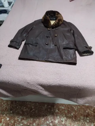 Chaqueta de cuero estilo canadiense, con un diseño vintage. 50 cm de hombro a hombro 63cm de manga No tiene cinturón Cuero flexible y en buen estado excepto en una manga que tiene un roce El forro interior y la piel del cuello se pueden quitar - Cuello de pelo sintético. - Cierre de botones.dw cuero - Bolsillos frontales.