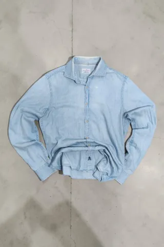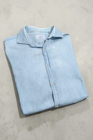 ⚡ Camisa vaquera ligera (tipo chambray) de manga larga Scalpers, un básico imprescindible para cualquier armario. 🏷️ Talla: S (Talla estimada por sus 42 cm de hombro, ideal para una complexión delgada). 📏 Medidas: 73 cm de largo x 42 cm de hombro a hombro. 🎨 Color: Azul claro / celeste con efecto vaquero lavado. ✅ Estado: Muy bueno. Presenta una marquita/mancha blanca visible en la zona del pecho. 🔎 Detalles: Cierre frontal de botones, cuello clásico y el característico logo de la calavera de Scalpers.
