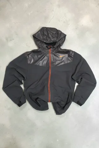 ⚡ Cortavientos técnico con capucha Nike Pro Training, diseño bicolor muy original con el panel superior metalizado. 🏷️ Talla: M (La talla estimada por sus 50 cm de hombro coincide perfectamente con la etiqueta). 📏 Medidas: 72 cm de largo x 50 cm de hombro a hombro. 🎨 Color: Gris oscuro / antracita en la base, parte superior gris metalizado y detalles (cremallera y logo) en naranja flúor/neón. ✅ Estado: Muy bueno. No se aprecian enganchones, roturas ni manchas. 🔎 Detalles: Cierre de cremallera completa en contraste, logo Swoosh estampado en el pecho, capucha ajustable.