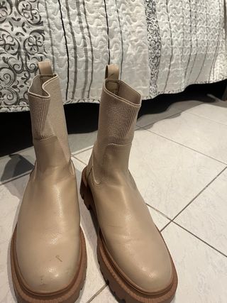 Botas de estilo chelsea en color beige. Perfectas para el día a día. - Material exterior de piel. - Detalle elástico en los laterales. - Suela gruesa y resistente.