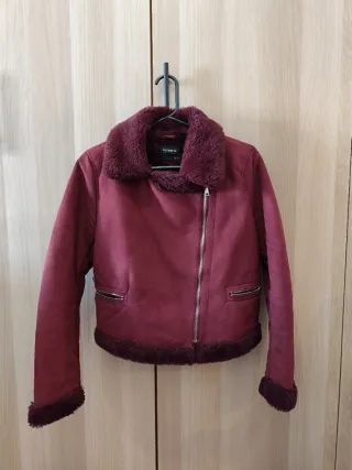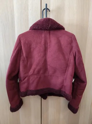Chaqueta de ante sintético con forro de pelo, talla M. - Cuello con solapas y detalle de pelo. - Cierre de cremallera asimétrico. - Bolsillos frontales con cremallera. - Puños y bajo con detalle de pelo.