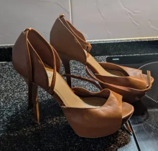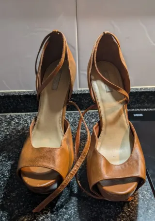 Elegantes zapatos marrones de tacón, casi nuevos y con muy poco uso. - Diseño abierto en la punta. - Tiras finas para atar al tobillo. - Tacón de aguja.