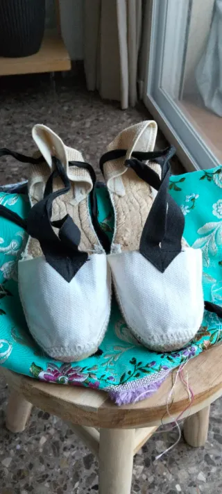 Espardeñas de estilo fallero, perfectas para lucir en fiestas. - Diseño con cintas negras para atar. - Base de esparto. - Parte delantera en tela blanca. NUEVAS SIN ESTRENAR, están un poco rozada la tela de estar guardada