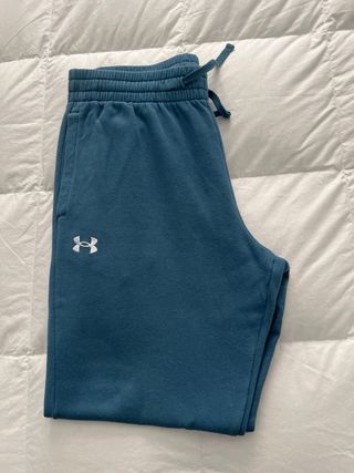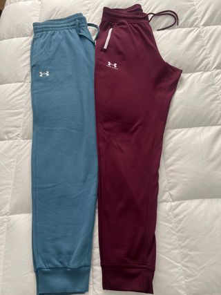 Pantalones de chándal de la marca Under Armour. - Un pantalón de color azul. Talla: L - Un pantalón de color granate. Talla: M - Cintura goma y cordón ajustable. - Bolsillos laterales. 22 uno y 40 los dos