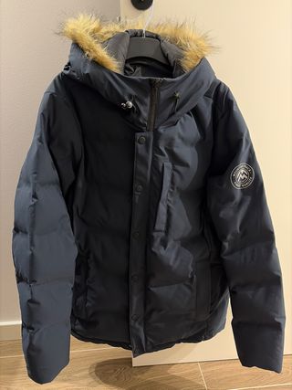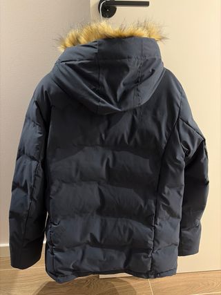 Chaqueta de invierno con capucha y detalles de pelo sintético. - Cierre de cremallera y botones. - Bolsillos frontales. - Logo circular en la manga.