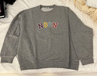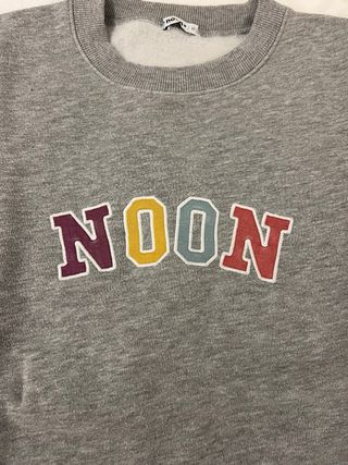 Sudadera gris con un diseño llamativo en el pecho. - Logo NOON con letras de colores. - Cuello redondo. - Puños y bajo acanalados.