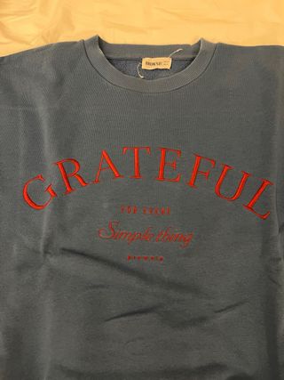 Sudadera azul con un diseño bordado en la parte delantera. Es una prenda cómoda y con estilo. - Bordado GRATEFUL en hilo rojo. - Pequeño texto FOR EVERY Simple thing debajo. - Detalle de etiqueta BROWNIE en el cuello.
