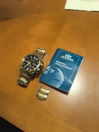 Reloj de pulsera con un diseño elegante y moderno. - Combinación de colores dorado y plateado. - Incluye eslabones adicionales para ajustar la correa.