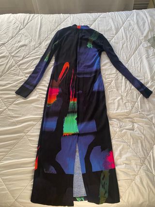 Vestido de manga larga con un diseño vibrante y moderno. - Estampado abstracto multicolor. - Cuello redondo. - Tejido acanalado.