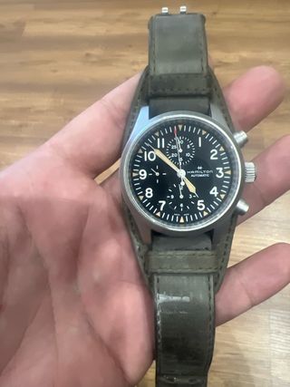 Reloj Hamilton con cronógrafo y su caja original. - Esfera negra. - Correa de cuero marrón. - Cierre de hebilla.