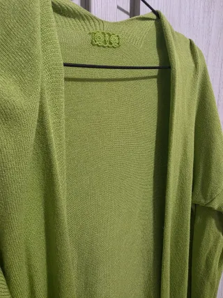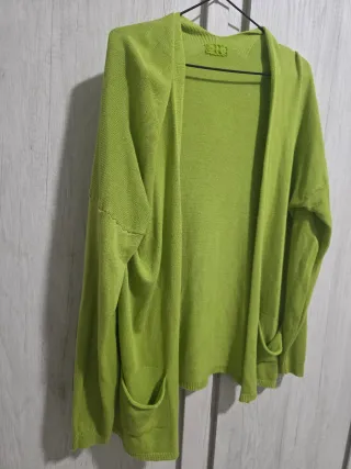 Chaqueta de punto fina con cuello abierto y bolsillos. - Diseño abierto. - Puños y bajo acanalados. - Dos bolsillos frontales. - Tejido suave y cómodo. En la foto de espalda, pueden observar que llevaba un lazo pero se lo he quitado ya que no cumplía ninguna función. Usada, pero en buen estado.