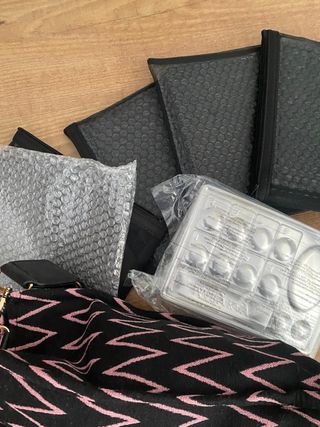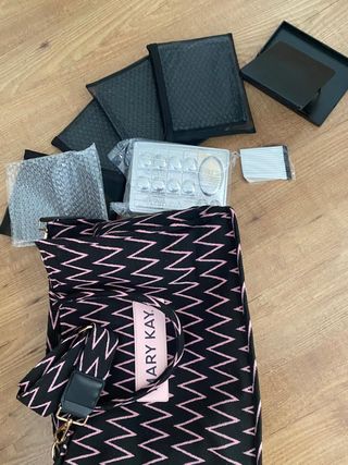 Conjunto de bolso y accesorios de Mary Kay. - Bolso con estampado zigzag en negro y rosa. - Correa de hombro ajustable. - Varios compartimentos y organizadores. - Incluye estuches y bandejas para maquillaje.