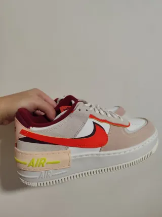 Zapatillas Nike Air Force 1 Shadow en tonos rosa y blanco. Un diseño moderno y llamativo. Talla 38'5 = 24'5 cm. - Combinación de ante y piel. - Detalles en naranja y burdeos. - Suela gruesa característica. Están sin estrenar, conservan la caja. Precio original 120€. No hago intercambios ni envíos a península. NO acepto devoluciones
