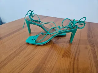 Elegantes sandalias de tiras con un diseño moderno. - Color verde vibrante. - Tira fina en la puntera. - Cierre con cordones al tobillo. - Tacón alto y fino. SOLO ENVIOS CANARIAS