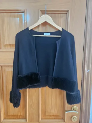 Elegante chaqueta corta de Calvin Klein. - Diseño abierto. - Detalle de pelo sintético en puños y bajo. - Manga larga. Etiqueta indica Talla S, pero es mas bien una M Usado 1 vez. Envíos solo Canarias