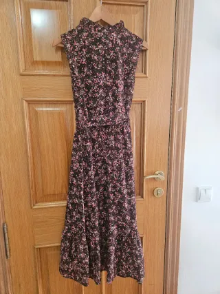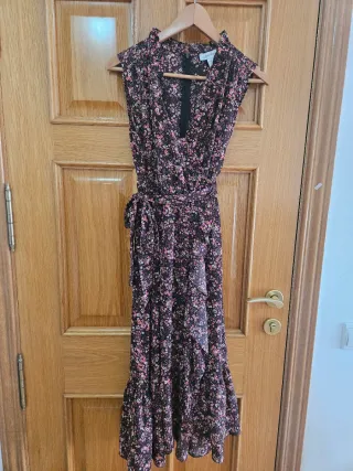 Vestido midi con estampado floral en tonos negros y rosados. - Diseño cruzado con cinturón. - Volantes en el bajo. - Escote en V. Envíos solo Canarias. Usado 1 vez