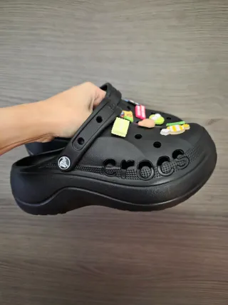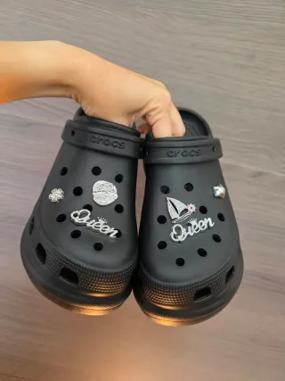 Zuecos Crocs negros con adornos Jibbitz. - Diseño clásico de Crocs. - Color negro. - Incluye varios Jibbitz decorativos.