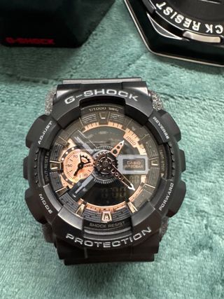 Reloj Casio G-Shock con un diseño deportivo y resistente. Presenta una combinación de colores negro y dorado que le da un toque moderno. - Esfera con detalles en dorado. - Correa de resina negra. - Resistente a golpes y al agua hasta 200 metros (WR20BAR).